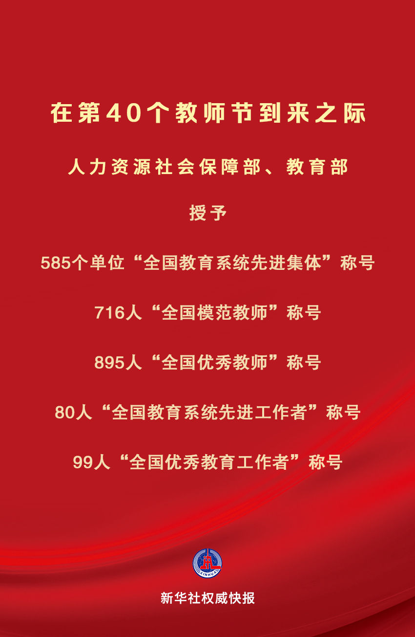 在中華人民共和國成立75周年和第40個教師節(jié)到來之際,為大力弘揚教育家精神,營造全社會尊師重教濃厚氛圍,激勵全國廣大教師和教育工作者落實立德樹人根本任務(wù),積極投身教育強(qiáng)國建設(shè),人力資源社會保障部、教育部決定授予中央財經(jīng)大學(xué)金融學(xué)院等585個單位“全國教育系統(tǒng)先進(jìn)集體”稱號;授予刁榮春等716名同志“全國模范教師”稱號;授予于淵等895名同志“全國優(yōu)秀教師”稱號;授予王彥平等80名同志“全國教育系統(tǒng)先進(jìn)工作者”稱號;授予王軍等99名同志“全國優(yōu)秀教育工作者”稱號。