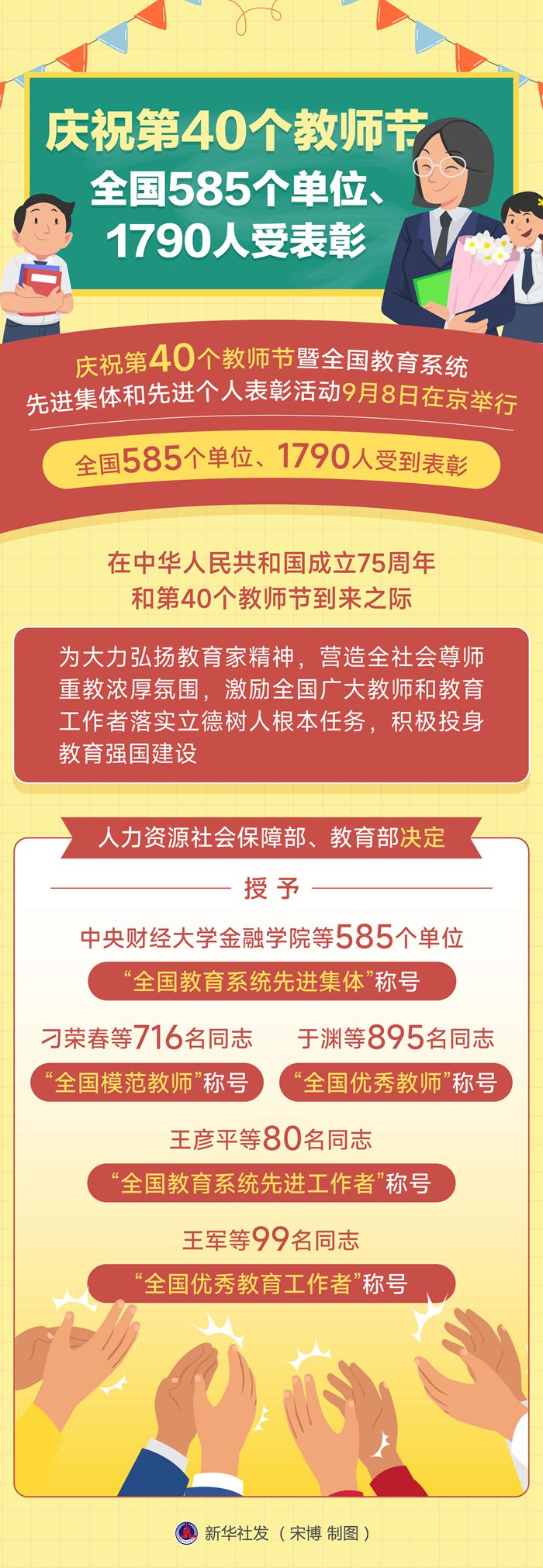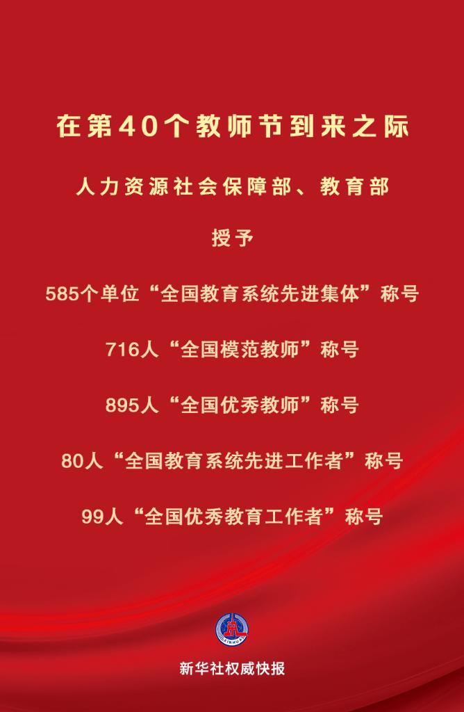 在中華人民共和國成立75周年和第40個教師節(jié)到來之際,為大力弘揚教育家精神,營造全社會尊師重教濃厚氛圍,激勵全國廣大教師和教育工作者落實立德樹人根本任務(wù),積極投身教育強(qiáng)國建設(shè),人力資源社會保障部、教育部決定授予中央財經(jīng)大學(xué)金融學(xué)院等585個單位“全國教育系統(tǒng)先進(jìn)集體”稱號;授予刁榮春等716名同志“全國模范教師”稱號;授予于淵等895名同志“全國優(yōu)秀教師”稱號;授予王彥平等80名同志“全國教育系統(tǒng)先進(jìn)工作者”稱號;授予王軍等99名同志“全國優(yōu)秀教育工作者”稱號。