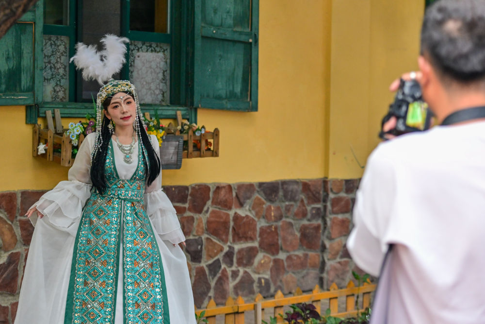 在新疆伊犁哈薩克自治州伊寧市六星街,游客體驗旅拍項目。新華社記者 丁磊 攝