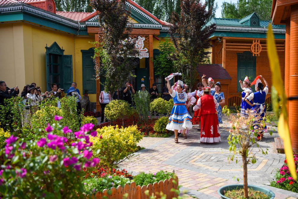 在新疆伊犁哈薩克自治州伊寧市六星街,當?shù)鼐用裉鹞璧笟g迎遠方來客。新華社記者 丁磊 攝