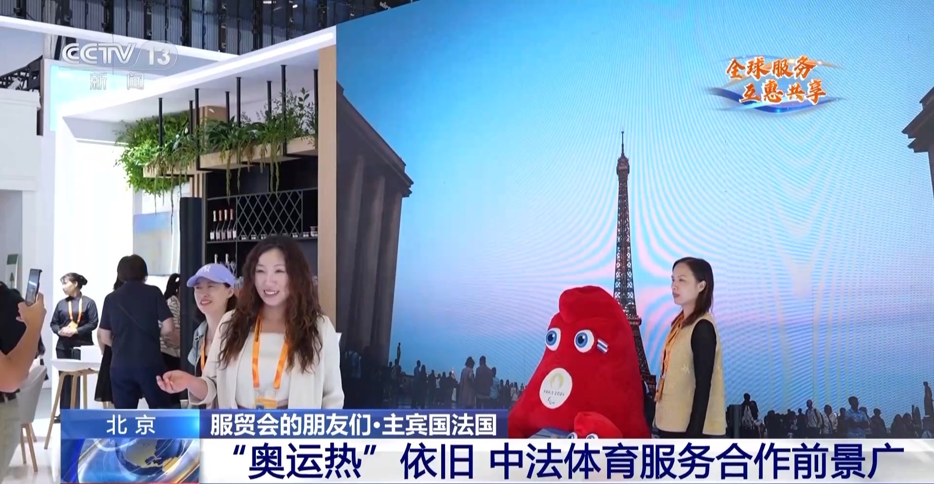 此次參會(huì),法國(guó)國(guó)家館設(shè)計(jì)了三大主題的展示和活動(dòng),體育是其中之一。記者在現(xiàn)場(chǎng)發(fā)現(xiàn),奧運(yùn)五環(huán)、巴黎奧運(yùn)會(huì)吉祥物“弗里熱”等元素依舊吸引了不少觀(guān)眾打卡拍照。娛樂(lè)文化與體育服務(wù)是服務(wù)貿(mào)易的重要領(lǐng)域。在本屆服貿(mào)會(huì)上,一些法國(guó)參展商也在尋求體育服務(wù)相關(guān)合作機(jī)會(huì)。