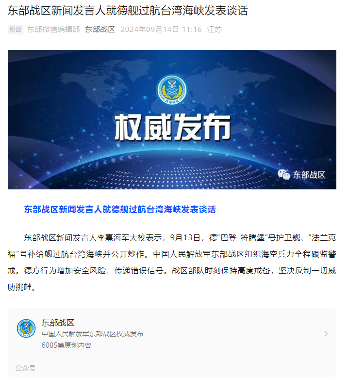 東部戰(zhàn)區(qū)新聞發(fā)言人李熹海軍大校表示,9月13日,德“巴登-符騰堡”號護(hù)衛(wèi)艦、“法蘭克福”號補(bǔ)給艦過航臺灣海峽并公開炒作。中國人民解放軍東部戰(zhàn)區(qū)組織??毡θ谈O(jiān)警戒。德方行為增加安全風(fēng)險、傳遞錯誤信號。戰(zhàn)區(qū)部隊時刻保持高度戒備,堅決反制一切威脅挑釁。