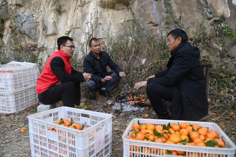 2023年12月25日,在廣西百色市樂業(yè)縣新化鎮(zhèn)百坭村,百色市委宣傳部駐百坭村第一書記農(nóng)俊海(左一)向群眾了解砂糖橘行情。新華社記者 陸波岸 攝