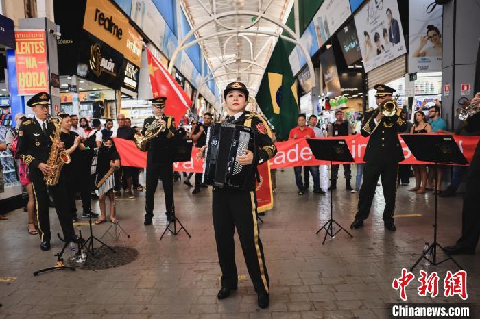 當?shù)貢r間9月21日,巴西首都巴西利亞,參加中國軍事文化周活動的中國人民解放軍軍樂團演出分隊,正在巴西利亞小商品市場演出。琚振華 攝