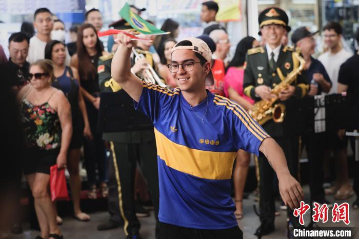 當《巴西水彩畫》《依帕內瑪?shù)呐ⅰ返劝臀鳟數(shù)囟炷茉數(shù)臉非懫饡r,現(xiàn)場氛圍掀起一個高潮,熱情奔放的巴西民眾紛紛走進“舞臺”中央,跟著節(jié)奏扭起了巴西特色的桑巴舞,還有人情不自禁地哼起了歌曲。