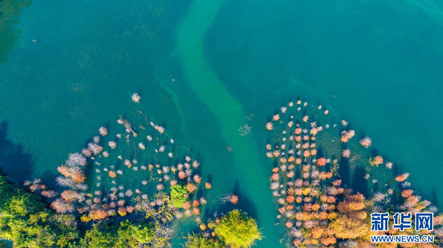 航拍廣東中山落羽杉與藍天碧水相映成趣。新華網發(fā)(黃健斌 攝)