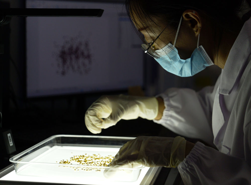 5月16日,中國農(nóng)科院中原研究中心科研人員在中原農(nóng)谷實驗室內(nèi)進行高粱樣品篩選。新華社記者 李嘉南 攝