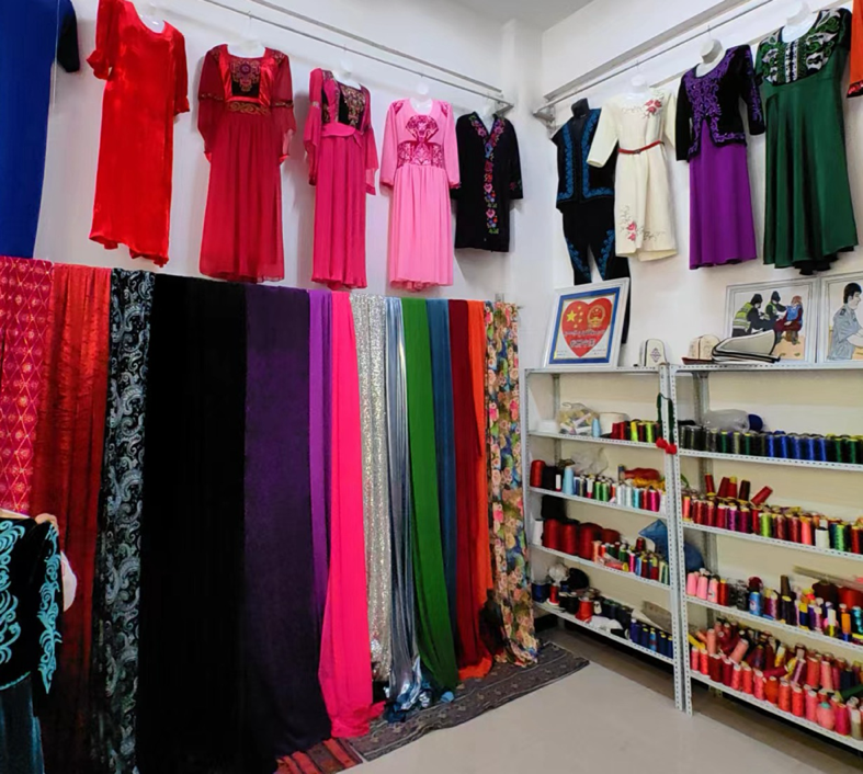 托云牧場積極鞏固政策支持,集中力量打造項目驅(qū)動,有效推進地方產(chǎn)業(yè)集群的全面發(fā)展,實現(xiàn)經(jīng)營集約化與產(chǎn)業(yè)高效整合。2015年,由牧場“刺繡巧匠”吐孔·沙熱牽頭并成功注冊了“托云牧場帕米爾刺繡”合作社。到了2019年,牧場成功申請到160萬元援疆資金,用于建設(shè)新的手工刺繡產(chǎn)品生產(chǎn)基地。在吐孔·沙熱的帶動下,合作社目前擁有60名成員,其中43名技藝嫻熟的繡工,年總收入攀升至三十萬。該合作社通過直銷、與克州百來思服裝店的業(yè)務(wù)合作,以及接受附近學(xué)校的校服訂單等多種渠道,將其生產(chǎn)的床品、家居布藝、女性服裝及校服推向阿圖什市、烏恰縣等地區(qū)市場。