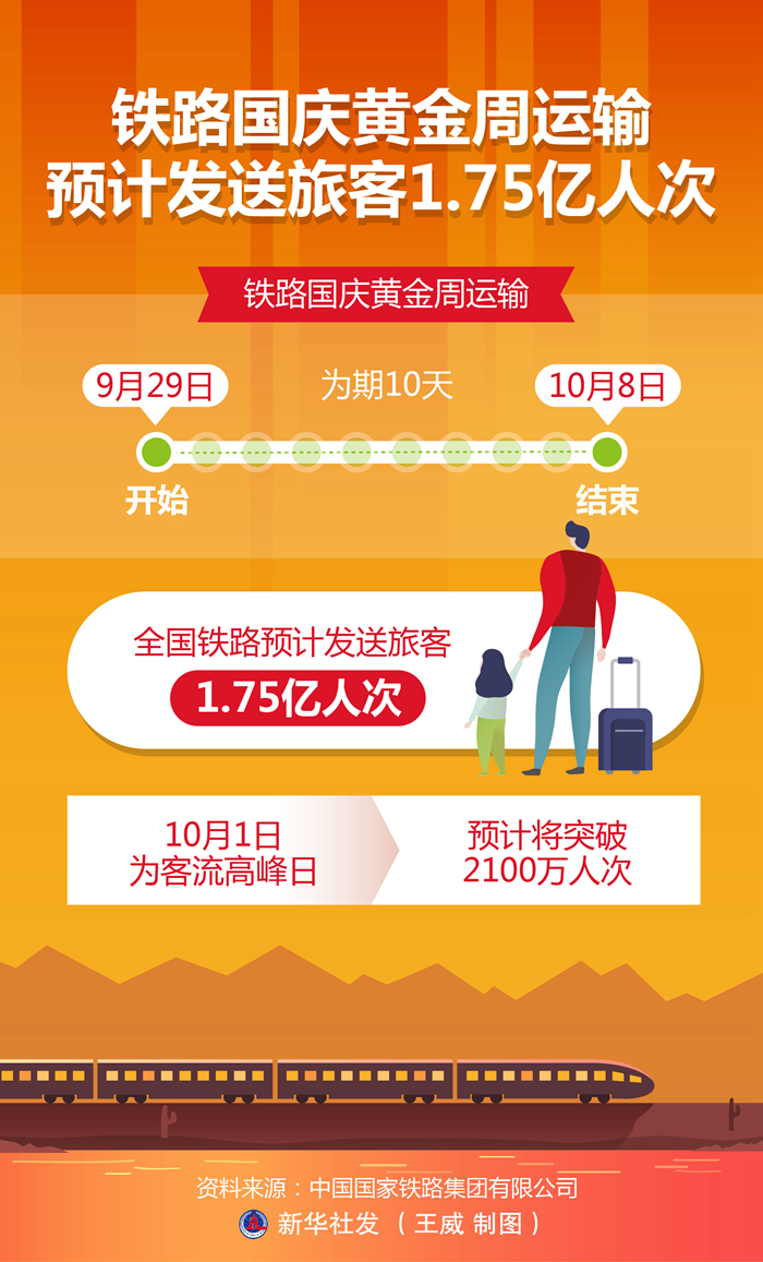 記者從中國國家鐵路集團有限公司獲悉,鐵路國慶黃金周運輸自9月29日開始,至10月8日結束,為期10天,全國鐵路預計發(fā)送旅客1.75億人次,10月1日為客流高峰日,預計將突破2100萬人次。