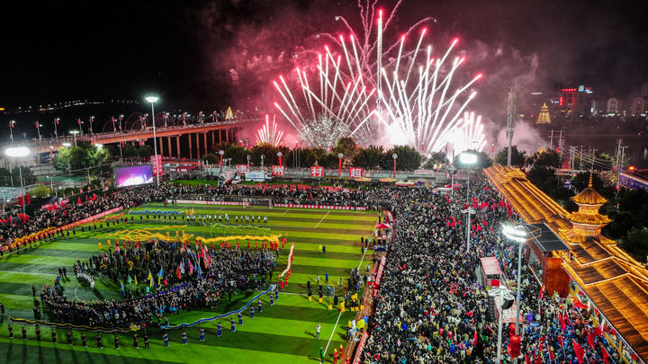2024年2月3日,在貴州省榕江縣,2024全國“村晚”示范展示活動(dòng)暨貴州“村超村晚”舉行音樂煙花秀表演(無人機(jī)照片)。新華社記者 劉續(xù) 攝