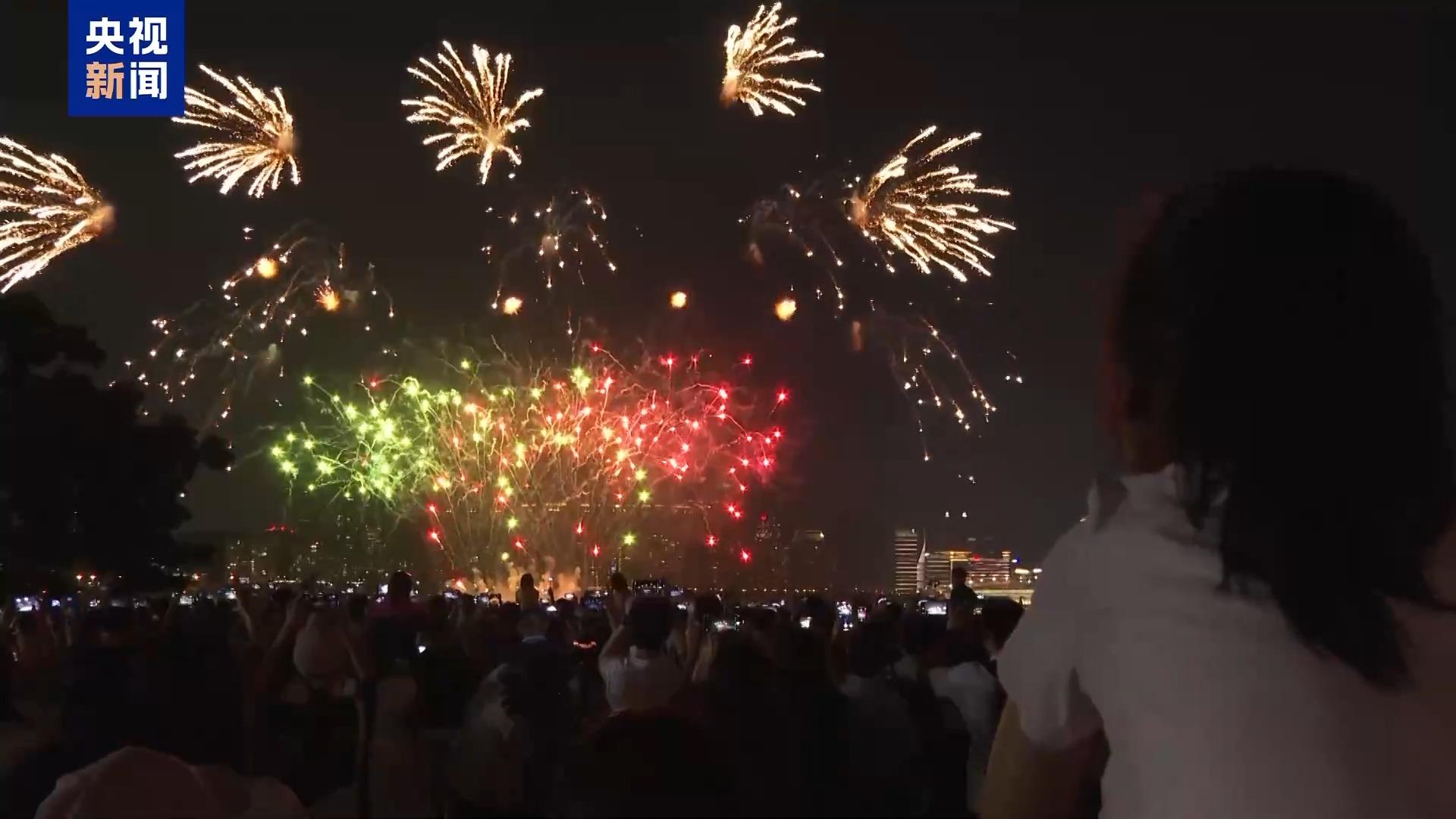 當(dāng)天21時(shí),中方煙花公司率先拉開了煙花匯演的序幕,在《七子之歌》和《歌唱祖國》等歌曲的伴奏下,一束束璀璨的煙花在空中綻放,形成了光彩奪目的美麗畫卷。