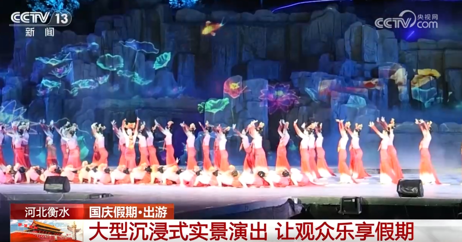 不僅白天能看演出,夜幕降臨后,在河北衡水市,大型沉浸式實景演出《大美衡水 湖韻千年》精彩上演,主舞臺演出以水為脈,通過音、舞、詩、畫巧妙融合,再加上3D投影等特效技術(shù)的靈活運用,營造出強烈的視覺效果和藝術(shù)沖擊力。
