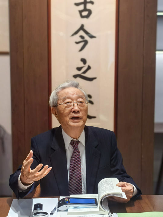 張晉藩教授在中國(guó)政法大學(xué)海淀校區(qū)圖書(shū)館薊門(mén)法史書(shū)苑(2024年9月13日攝)。新華社發(fā)(盧云開(kāi) 攝)