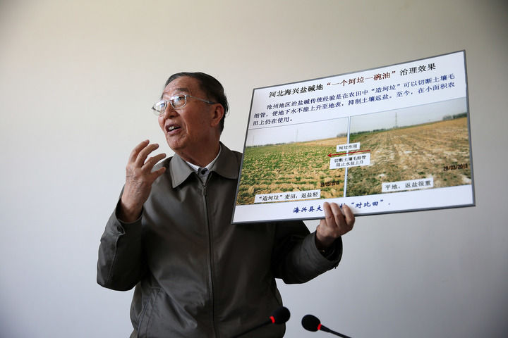 李振聲院士在介紹河北海興鹽堿地治理的前后對(duì)比照片(2014年5月5日攝)。新華社記者 金立旺 攝