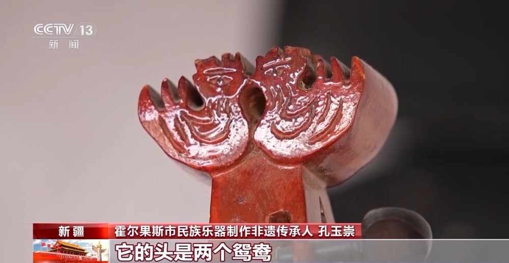 霍爾果斯市民族樂器制作非遺傳承人 孔玉崇:鴛鴦是很美好的,它有兩個(gè)腹板,也可以互為背板。它的頭是兩個(gè)鴛鴦,在一個(gè)腿上可以彈,坐著也可以拉,很方便。你帶著這么一把琴就等于帶了兩把琴,因?yàn)樗囊灿校瑥椀囊灿小?/p>
