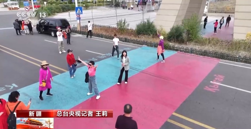 總臺央視記者 王莉:進(jìn)入合作中心,中哈連接通道處的“一步跨兩國”,絕對是游客的打卡首選地。紅色和藍(lán)色交界的地方,就是國界線了,線的一側(cè)紅色區(qū)域代表中國,藍(lán)色區(qū)域代表哈薩克斯坦。前一秒還在中國,只要一腳邁過分界線,就能一秒“出國”,來到哈薩克斯坦。