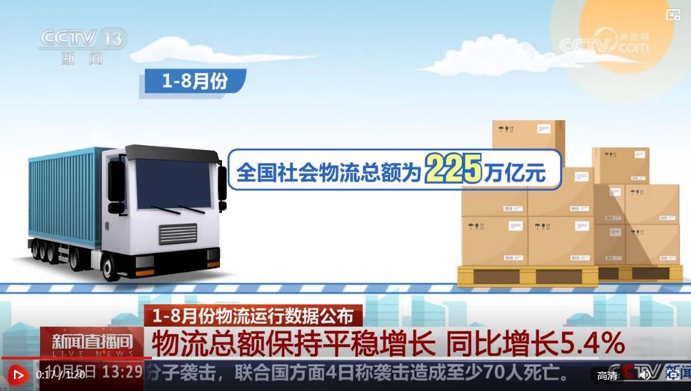 央視網(wǎng)消息:中國物流與采購聯(lián)合會(huì)10月5日公布今年1至8月份物流運(yùn)行數(shù)據(jù)。數(shù)據(jù)顯示,8月份社會(huì)物流運(yùn)行總體穩(wěn)定,社會(huì)物流總額累計(jì)保持5%以上的穩(wěn)定增長。