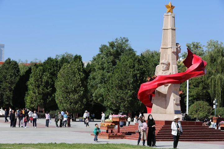 10月2日,游客在甘肅省白銀市會寧縣紅軍會寧會師舊址參觀。