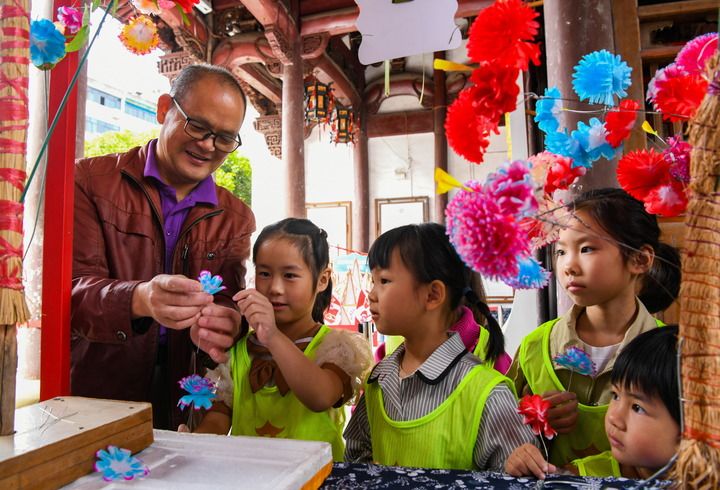 10月4日,在浙江省金華府城隍廟,小朋友觀看手工藝人制作紙花。