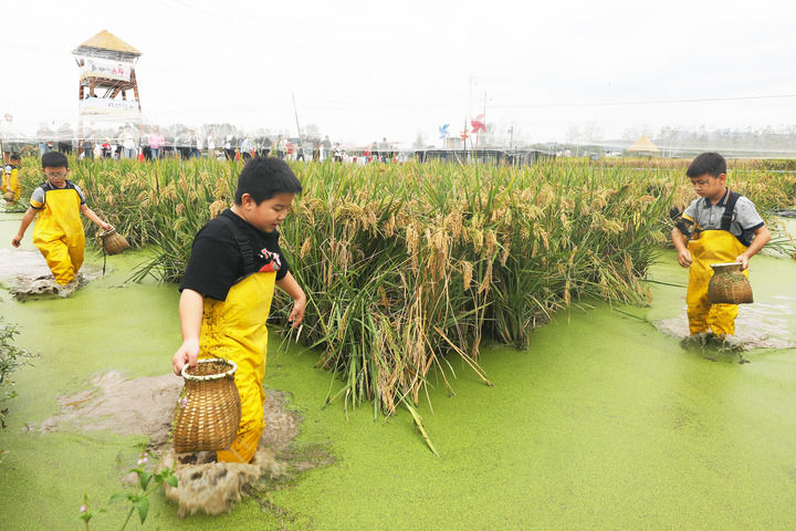 10月3日,孩子們在浙江省義烏市赤岸鎮(zhèn)一處稻魚共生的稻田里捉魚。