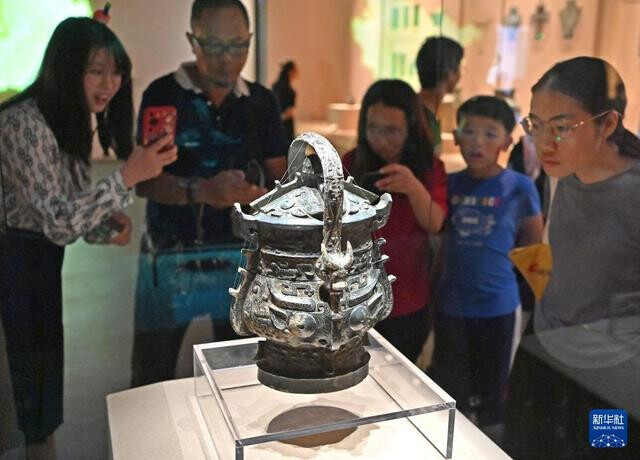▲10月1日,在廣西壯族自治區(qū)博物館“鑄于銅 融于心——廣西館藏青銅器中的‘三交’印記”特展上,觀眾在參觀。新華社記者 周華 攝