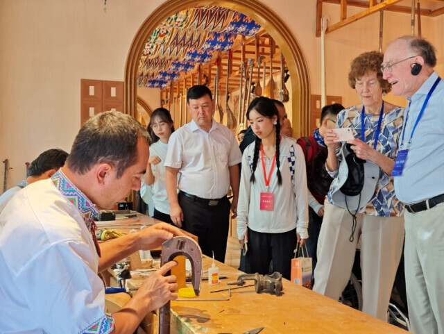▲2024年6月,“中國新疆的歷史與未來”國際論壇的外國專家在疏附縣“中國新疆民族樂器村”考察。中國民族報(bào)記者李翠攝