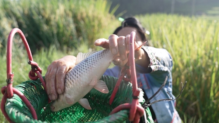 而侗族人民的智慧遠(yuǎn)不止于此,他們巧妙地利用當(dāng)?shù)刈匀画h(huán)境,孕育出獨(dú)特的“稻魚(yú)鴨”共生稻作文化。從江縣往洞鎮(zhèn)增沖種植養(yǎng)殖專(zhuān)業(yè)合作社負(fù)責(zé)人石剛勇說(shuō),“種植一季稻、放養(yǎng)一批魚(yú)、飼養(yǎng)一批鴨,稻魚(yú)鴨系統(tǒng)能夠和諧共存,是因?yàn)榇蛄藭r(shí)間差。種稻的時(shí)候放魚(yú)苗,魚(yú)苗能清理土壤,讓土壤疏松。等到農(nóng)歷的三月下旬或四月上旬,再放入鴨苗。此時(shí)的秧苗已經(jīng)長(zhǎng)成,剛出生不久的鴨苗不會(huì)損壞秧苗,鴨子吃田里的蟲(chóng)子,它們的糞便喂魚(yú),魚(yú)糞又滋養(yǎng)稻谷,這就形成了一個(gè)完美的生態(tài)循環(huán)?!?/p>