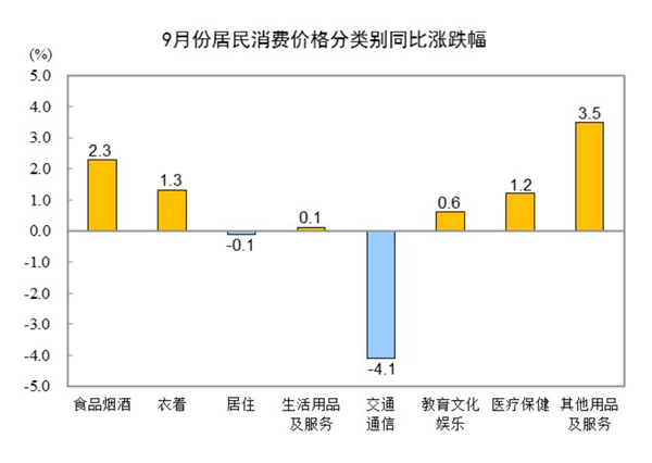9月份,全國居民消費價格環(huán)比持平。其中,城市下降0.1%,農村上漲0.1%;食品價格上漲0.8%,非食品價格下降0.2%;消費品價格上漲0.2%,服務價格下降0.3%。