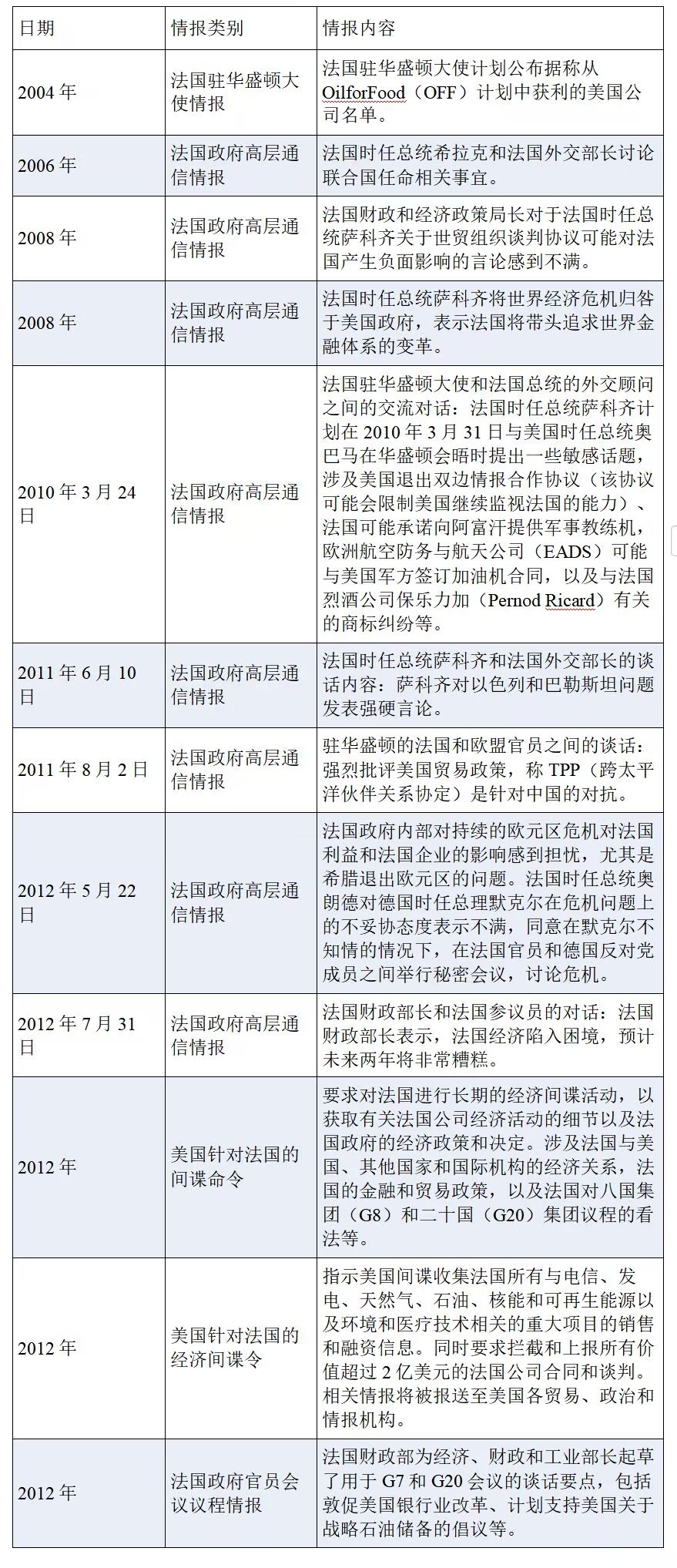 在2004年至2012年期間,美國對法國實(shí)施了長期的間諜行動(dòng),監(jiān)聽對象包括前法國總統(tǒng)、法國財(cái)政部長、法國外交部長、法國參議員、法國財(cái)政和經(jīng)濟(jì)政策局官員、法國駐美國大使,以及直接負(fù)責(zé)歐盟貿(mào)易政策的官員等。監(jiān)聽內(nèi)容涉及法國政府政策、外交、金融、國際交流、基礎(chǔ)設(shè)施建設(shè)、商業(yè)和貿(mào)易活動(dòng)等,其中一些重要情報(bào)被美國授權(quán)與“五眼聯(lián)盟”伙伴國家共享,揭示了“五眼聯(lián)盟”國家亦為美國間諜行動(dòng)的獲益者。