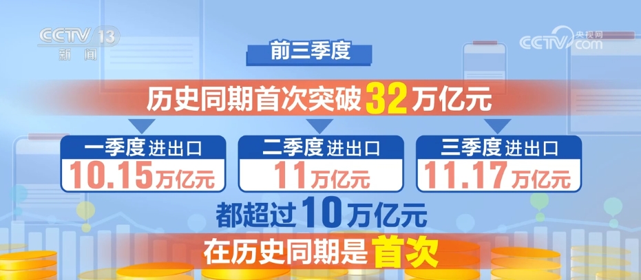 前三季度,歷史同期首次突破32萬億元,各季度分別進(jìn)出口10.15萬億元、11萬億元、11.17萬億元,都超過了10萬億元,這在歷史同期也是首次。
