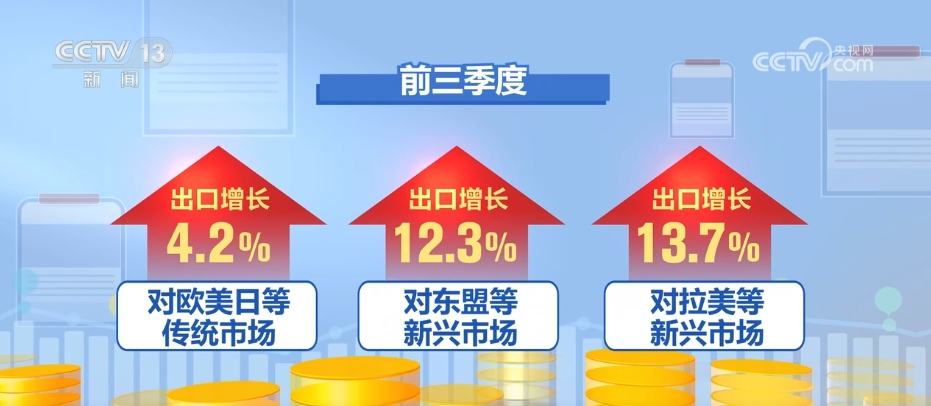 需求方面,從國際看,最新的世貿(mào)組織報告上調(diào)了對全年貨物貿(mào)易量增速的預(yù)測,世界銀行、經(jīng)合組織等機(jī)構(gòu)認(rèn)為全球經(jīng)濟(jì)正在企穩(wěn),外需回暖為我國出口創(chuàng)造了有利條件。前三季度,我國對歐美日等傳統(tǒng)市場出口增長了4.2%,對東盟、拉美等新興市場出口分別增長了12.3%、13.7%。