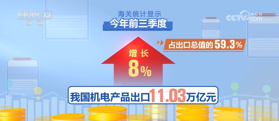 海關(guān)統(tǒng)計(jì)顯示,今年前三季度,我國出口產(chǎn)品結(jié)構(gòu)優(yōu)化,高端裝備出口增長超4成。機(jī)電產(chǎn)品出口11.03萬億元,增長8%,占出口總值的59.3%。其中,高端裝備出口增長43.4%,集成電路、汽車、家用電器出口分別增長22%、22.5%、15.5%。此外,傳統(tǒng)勞動密集型產(chǎn)品出口3.13萬億元,增長2.8%。