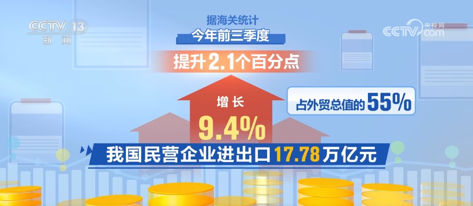 據(jù)海關(guān)統(tǒng)計(jì),今年前三季度,我國民營企業(yè)進(jìn)出口17.78萬億元,增長9.4%,占外貿(mào)總值的55%,提升2.1個百分點(diǎn);外商投資企業(yè)進(jìn)出口9.53萬億元,增長1.1%,連續(xù)兩個季度增長;國有企業(yè)進(jìn)出口4.95萬億元,增長0.1%。