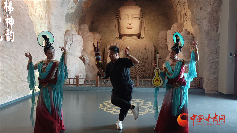 “我覺(jué)得你的舞蹈動(dòng)作可以再柔和一點(diǎn),再飄逸一點(diǎn),要給人從壁畫中飛出來(lái)的那種感覺(jué)?!痹谖渫胁┪镳^天梯山仿真石窟展區(qū),付泓正在給排練西涼樂(lè)舞的舞蹈演員講要領(lǐng),他希望西涼樂(lè)舞可以像壁畫里飛出來(lái)的那樣,再現(xiàn)千年涼州的繁華。