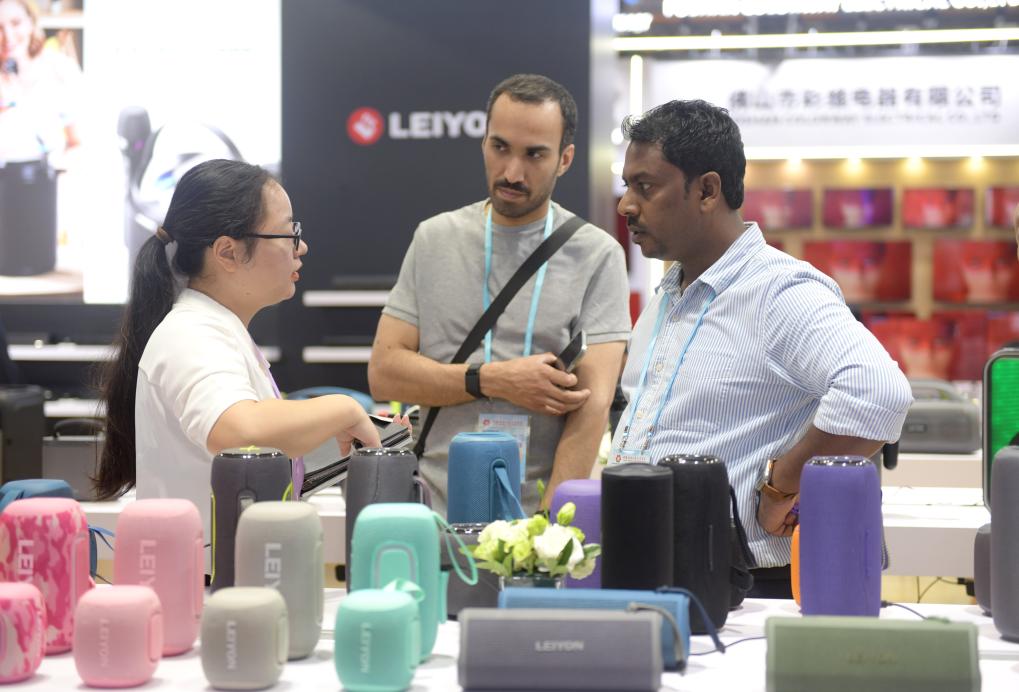 10月15日,客商在廣交會展館內(nèi)參觀選購音箱。新華社記者盧漢欣 攝