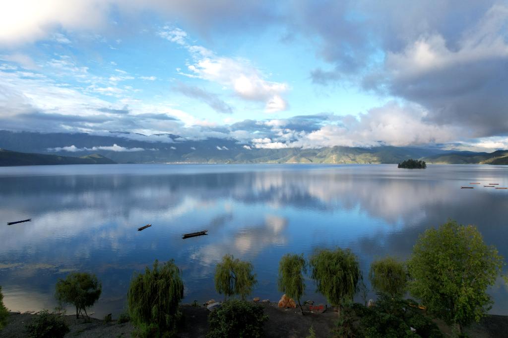 早晨的瀘沽湖湖面如鏡。(宋明 攝)