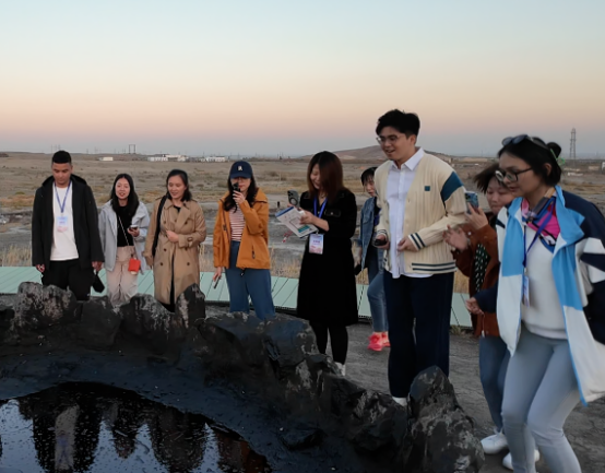 在黑油山最著名的景點(diǎn)——“跳跳泉油池”,黑油山景區(qū)講解員麥爾哈巴·肉扎洪帶領(lǐng)訪問(wèn)團(tuán)代表們利用壓力傳導(dǎo)作用,在它的周?chē)吅斑吿?,眼?jiàn)著它冒的泡泡越來(lái)越多,讓大家興奮不已。麥爾哈巴·肉扎洪說(shuō):“經(jīng)過(guò)三代人的努力,克拉瑪依變成了現(xiàn)在這樣宜居宜業(yè)宜游的現(xiàn)代化高品質(zhì)城市,希望可以把克拉瑪依艱苦創(chuàng)業(yè)的精神傳達(dá)給大家,也可以把這種活力傳達(dá)給大家?!?/p>