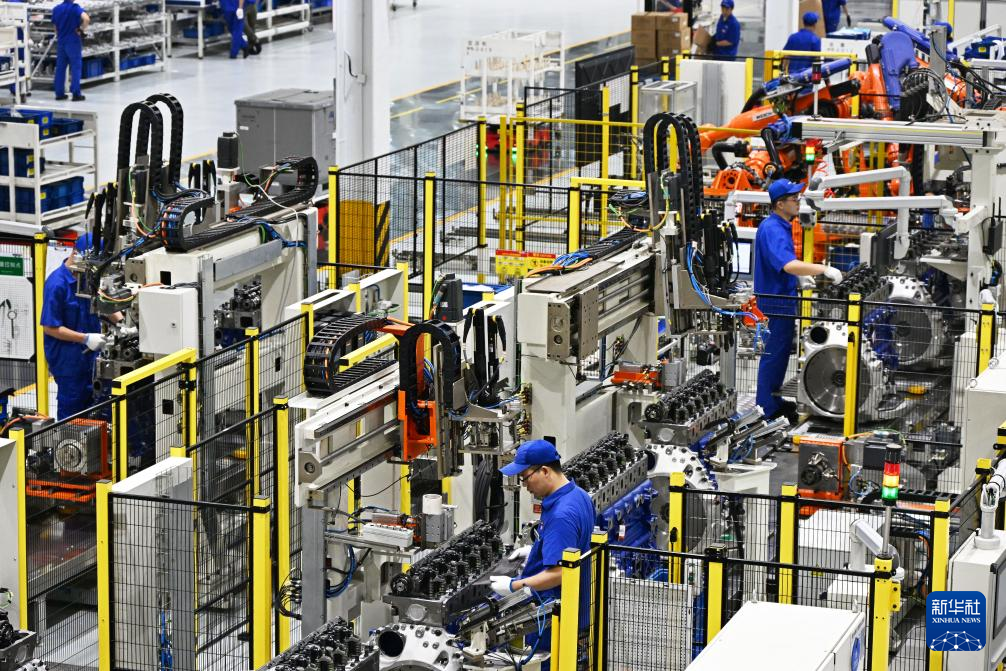 在濰柴集團車間內(nèi),工人在裝配發(fā)動機(8月21日攝)。新華社記者 李紫恒 攝