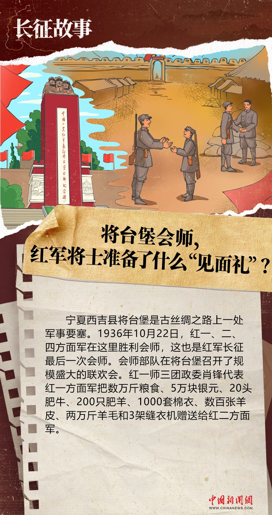 寧夏西吉縣將臺(tái)堡是古絲綢之路上一處軍事要塞。1936年10月22日,紅一、二、四方面軍在這里勝利會(huì)師,這也是紅軍長(zhǎng)征最后一次會(huì)師。會(huì)師部隊(duì)在將臺(tái)堡召開了規(guī)模盛大的聯(lián)歡會(huì)。紅一師三團(tuán)政委肖鋒代表紅一方面軍把數(shù)萬斤糧食、5萬塊銀元、20頭肥牛、200只肥羊、1000套棉衣、數(shù)百張羊皮、兩萬斤羊毛和3架縫衣機(jī)贈(zèng)送給紅二方面軍。