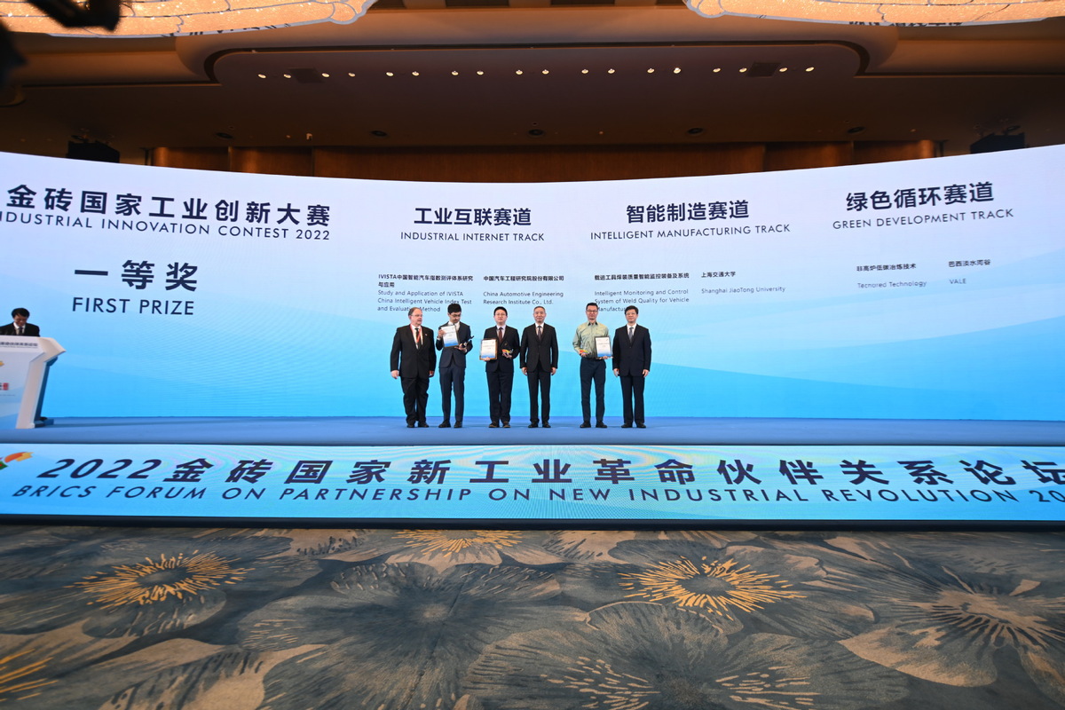 2022年9月7日,2022金磚國家工業(yè)創(chuàng)新大賽一等獎(jiǎng)獲得者和頒獎(jiǎng)嘉賓在廈門合影。(圖片來源:新華社)