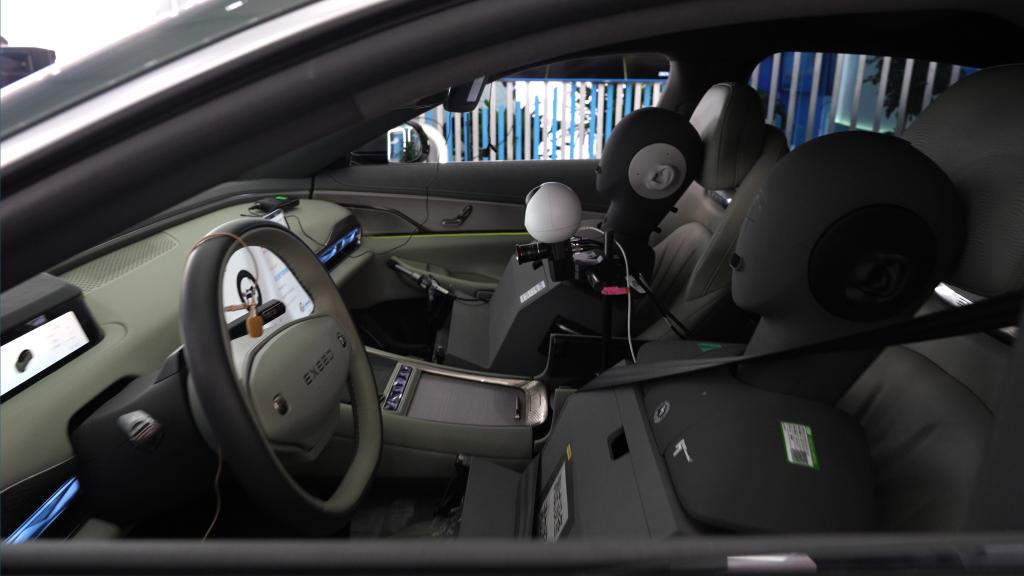 在展區(qū)中的一輛新能源汽車內(nèi)部,一臺機器人正在模擬乘客與汽車進行語音交互,汽車外的一塊大屏幕上,實時分析顯示語音交互效果的準確性、穩(wěn)定性和及時性,并最終自動生成報告。這款智能座艙人機交互效果評測機器人首次亮相,便吸睛無數(shù)。
