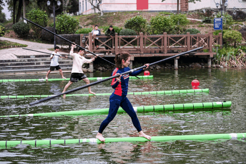 2019年4月4日,河池學(xué)院獨(dú)竹漂隊(duì)的隊(duì)員在廣西桂林市舉行的“民族體育炫”系列比賽中參加獨(dú)竹漂項(xiàng)目的比賽。