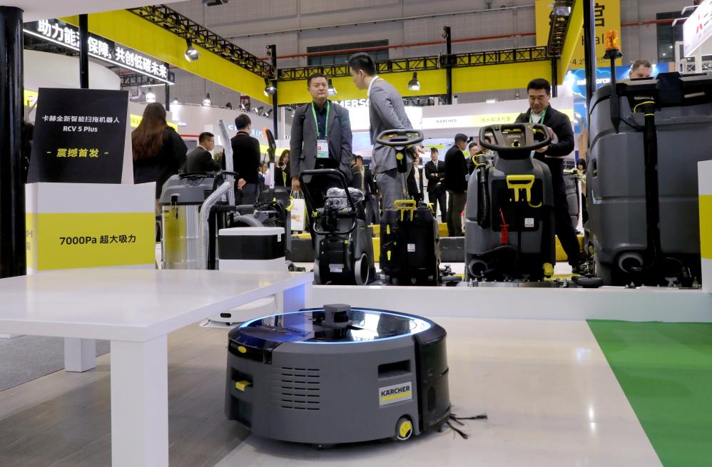 11月6日,一臺卡赫全新智能掃拖機(jī)器人RCV 5 Plus(前)在進(jìn)行作業(yè)演示。這是該產(chǎn)品在進(jìn)博會上的首展首發(fā)。新華社記者 方喆 攝