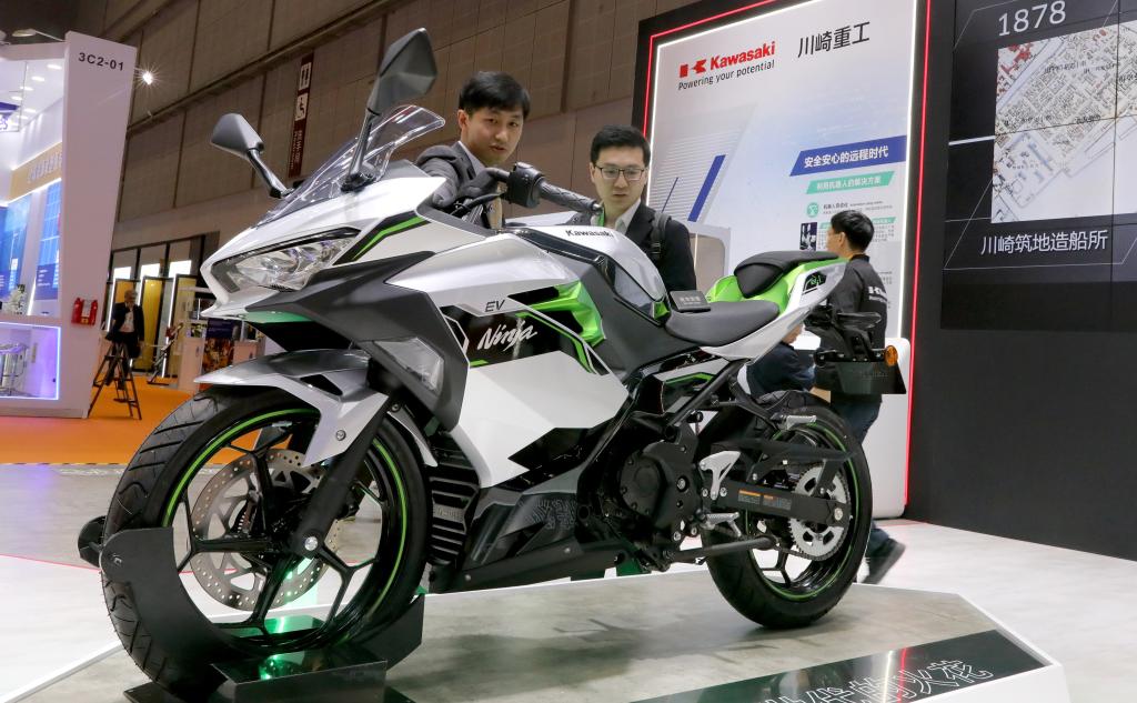 11月6日,工作人員(左)在川崎公司展臺為參觀者介紹一款電動摩托車。這是該產(chǎn)品在進(jìn)博會上的首展。新華社記者 方喆 攝