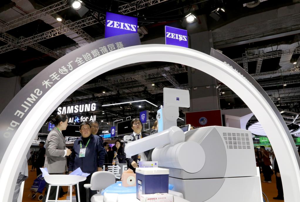 11月6日,參觀者在蔡司公司展臺展出的新一代機(jī)器人全飛秒前交流討論。這是該產(chǎn)品在進(jìn)博會上的首展。新華社記者 方喆 攝