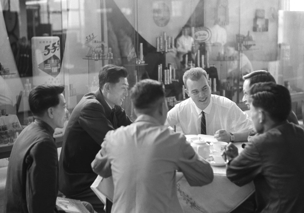 1965年,挪威商人萊伊夫·斯契瓦伯和中國交易團(tuán)工作人員在第17屆廣交會(huì)上洽談交易。新華社記者 蔡忠植 攝