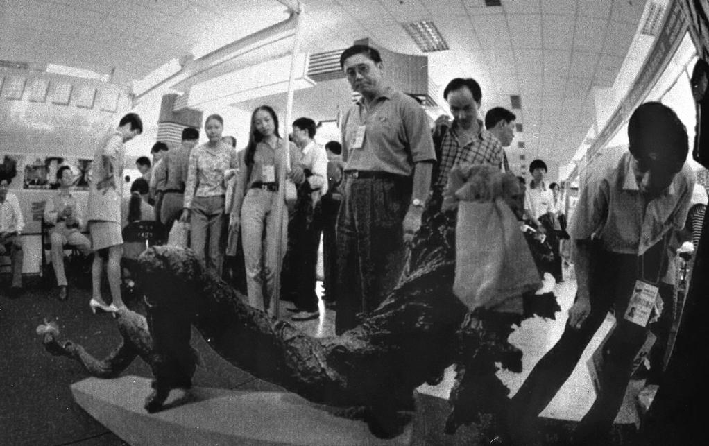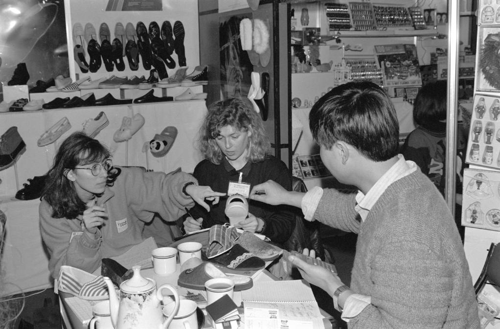 1991年3月,在上海舉行的首屆華東出口商品交易會(huì)(后發(fā)展為華東進(jìn)出口商品交易會(huì),簡稱“華交會(huì)”)上,兩名意大利客商同浙江省輕工業(yè)品進(jìn)出口公司代表洽談業(yè)務(wù)。新華社記者 柳中央 攝