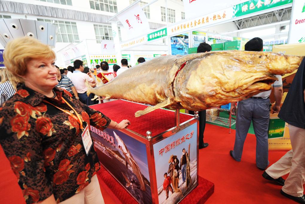 2008年6月15日,在第19屆中國哈爾濱國際經(jīng)濟(jì)貿(mào)易洽談會(huì)(后與中國-俄羅斯博覽會(huì)合并舉辦)上,一位客商在鱘鰉魚標(biāo)本旁留影。新華社記者 王建威 攝