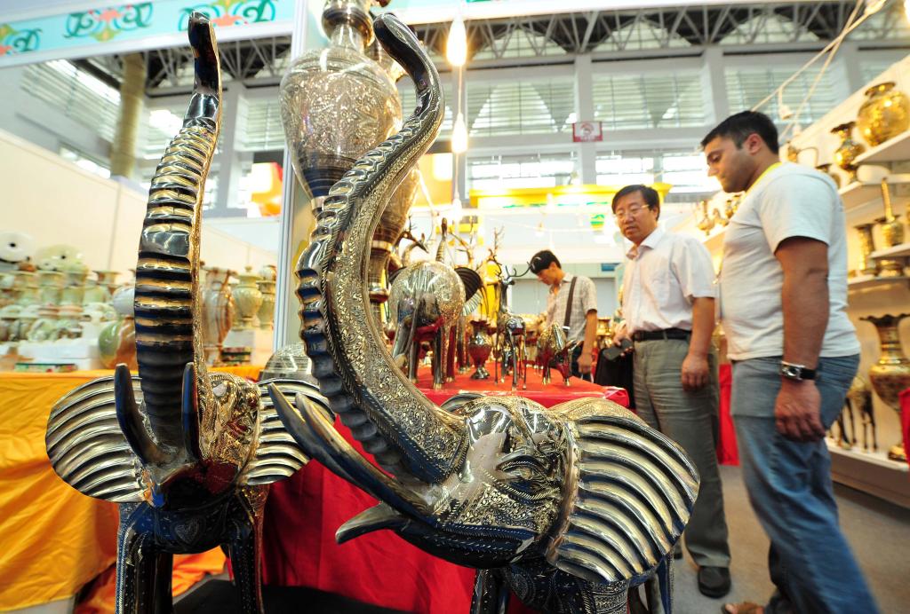 2013年9月15日,在寧夏銀川舉行的首屆中國-阿拉伯國家博覽會(huì)上,觀展者咨詢選購巴基斯坦展區(qū)的特色展品黃銅雕塑。