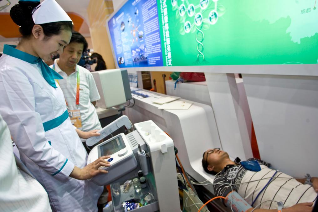 2012年5月28日,觀眾在首屆中國(北京)國際服務(wù)貿(mào)易交易會(huì)(簡稱“京交會(huì)”,后發(fā)展為中國國際服務(wù)貿(mào)易交易會(huì),即“服貿(mào)會(huì)”)體驗(yàn)全方位健康體檢。新華社發(fā)(趙冰 攝)